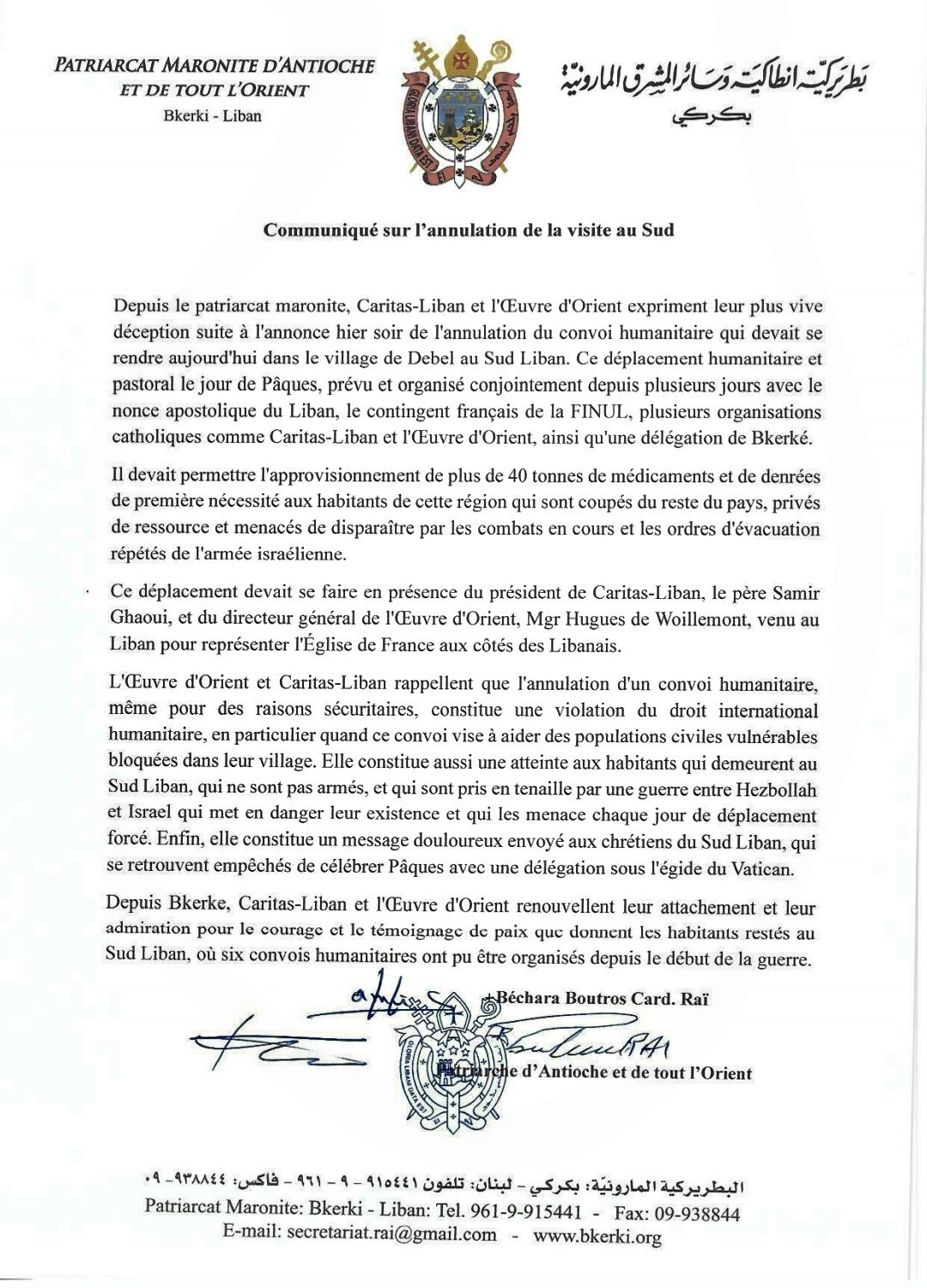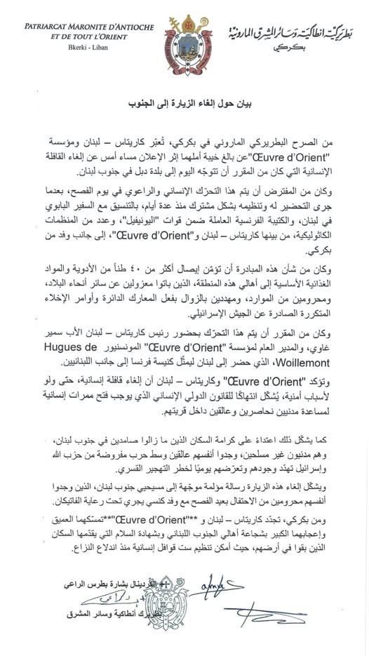Announcement on the cancellation of the visit to south Lebanon 05/04/2026 أخبار بيان A+ A A- الاحد 5 نيسان 2026